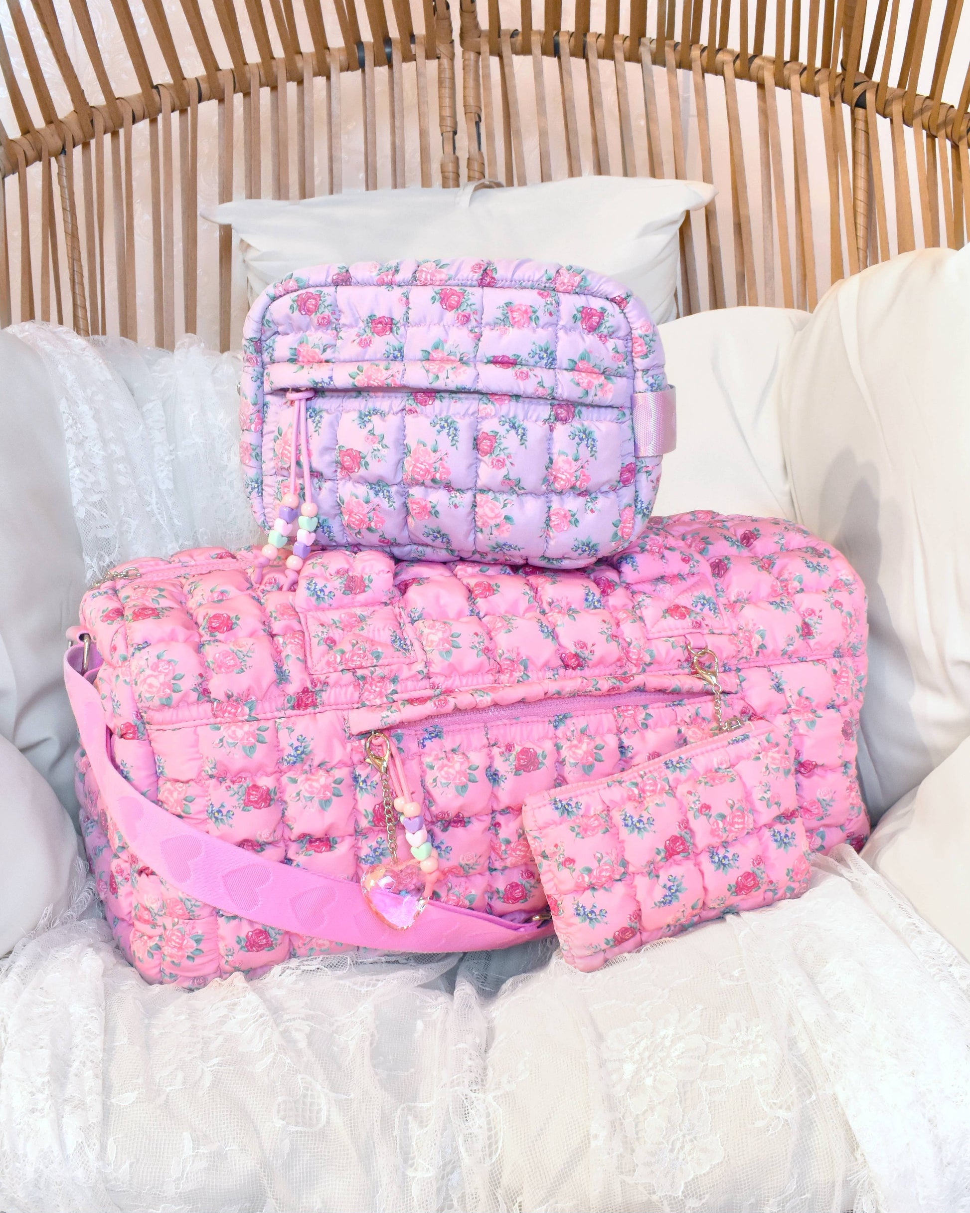 Flower power! Where style meets versatility, our classic duffle bag silhouette gets a flirty upgrade! From their extra cirriculars, to the gym, dance class, weekend getaways, and everywhere else in between - they'll be carrying it all in our new nylon quilted pink ditzy floral printed large duffle with a zipper closure front pocket and adjustable carry strap. It even comes with a matching coin purse!